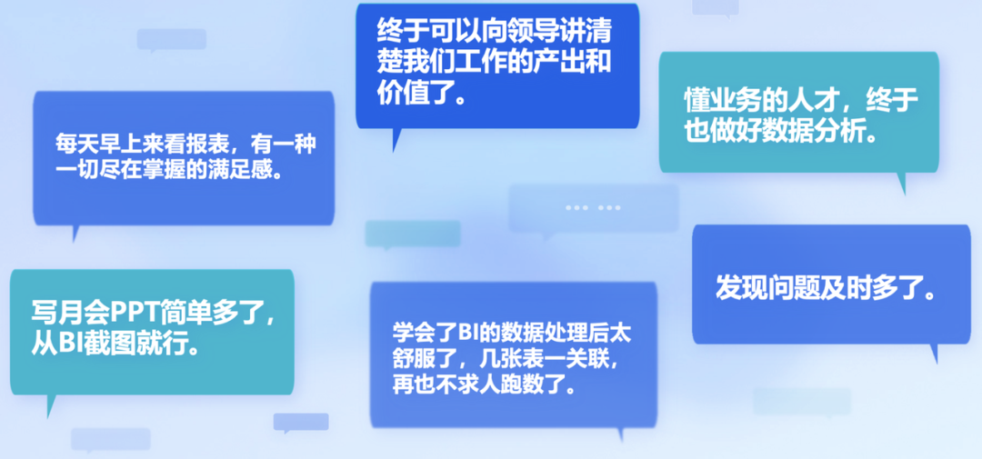 “数据这个事情它日常是必须有的。只不过说 BI 的出现给了它一个大幅提升效率、并且极大地扩展它的深度和广度的一个机会。但前提是能够推动BI或其他数字化产品让业务用起来,应该采取解决痛点、提供良好服务的策略,取得他人的信任后再谈论产品的价值。”张志明说道。
