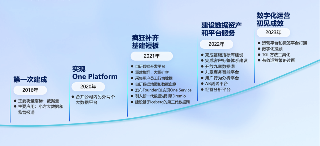 从2016年开始到2021年,方正证券积极开展了数据中台的建设,但随着公司数字化转型的推进,出现了一些有趣的现象。比如数字化早期,业务大量的时间用于从业务系统中下载数据,然后在本地Excel中进行整合,导致数据中台建设虽初具雏形,但是没有很好地发挥对应的业务价值。经过深入了解,发现营业部等一线业务对数据获取的诉求远高于算法模型等复杂数据应用,如何更快更高效地获取到自己想要的数据是摆在一线业务面前的核心痛点。