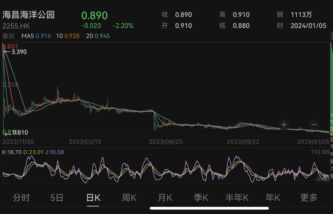 至今,海昌海洋公园股价仍在1港元下方徘徊。