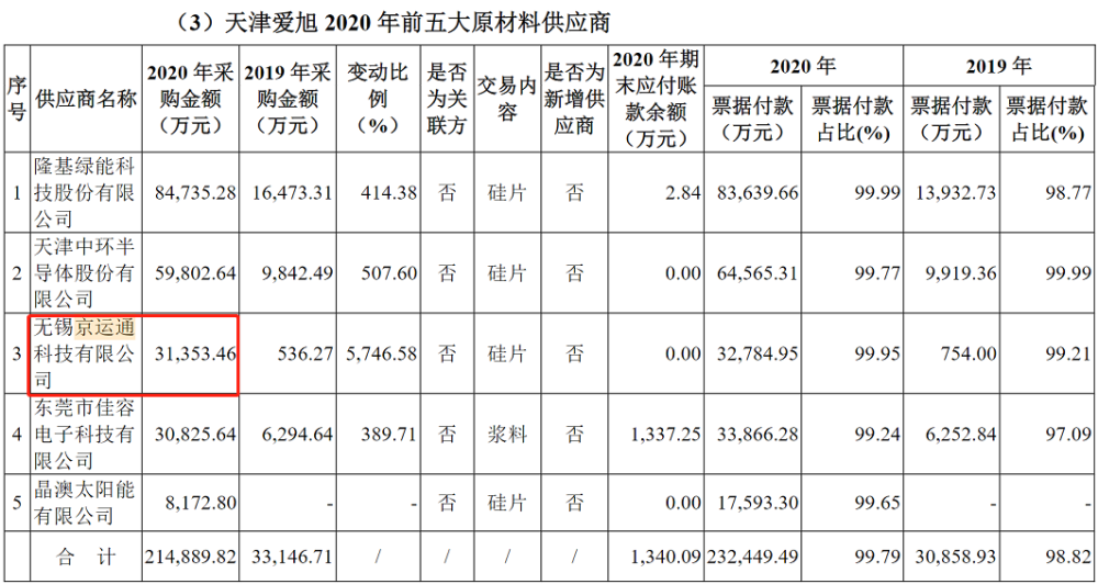 在爱旭股份对上交所2020年年报问询函的回复中曾披露公司前五大供应商。其中京运通位列第三位,2020年对爱旭股份的销售额为3.14亿元,约占当期京运通硅片产品营收的18%。