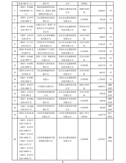 京运通还披露了公司及子公司连续12 个月内发生的诉讼和仲裁情况。该公司及其子公司作为被告,涉诉金额在500万以的诉讼、仲裁合计达到21起,累计涉案金额达105,129.65万元。乐山京运通、无锡京运通、乌海京运通等子公司均卷入其中。