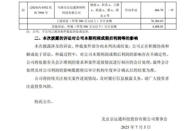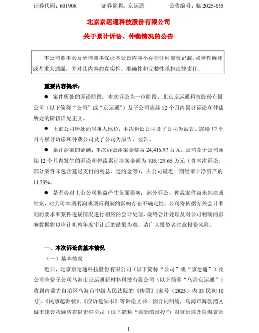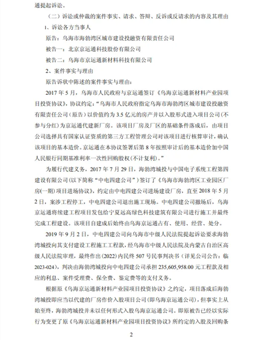 7月4日,京运通发布了关于累计诉讼、仲裁情况的公告显示,因合同纠纷,乌海市海勃湾区城市建设投融资有限责任公司(简称“乌海勃湾城投”)对京运通及其子公乌海市京运通新材料科技有限公司(简称“乌海京运通”)提起诉讼,要求二者支付代建工程款、利息、诉讼费用等合计244,169,724.84元。