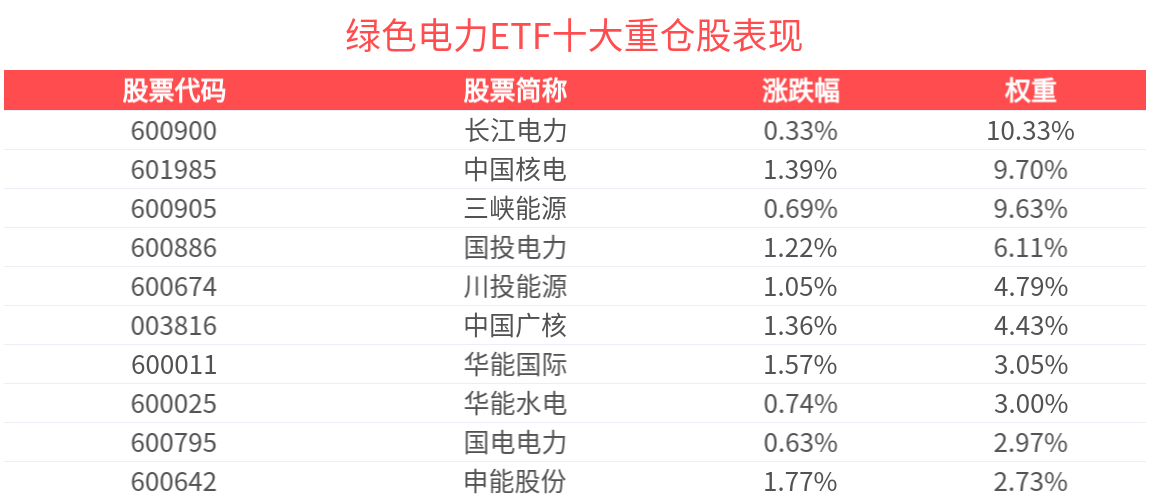 数据显示,截至2025年6月30日,国证绿色电力指数前十大权重股分别为长江电力、三峡能源、中国核电、国投电力、川投能源、中国广核、国电电力、华能水电、华能国际、申能股份,前十大权重股合计占比56.91%。