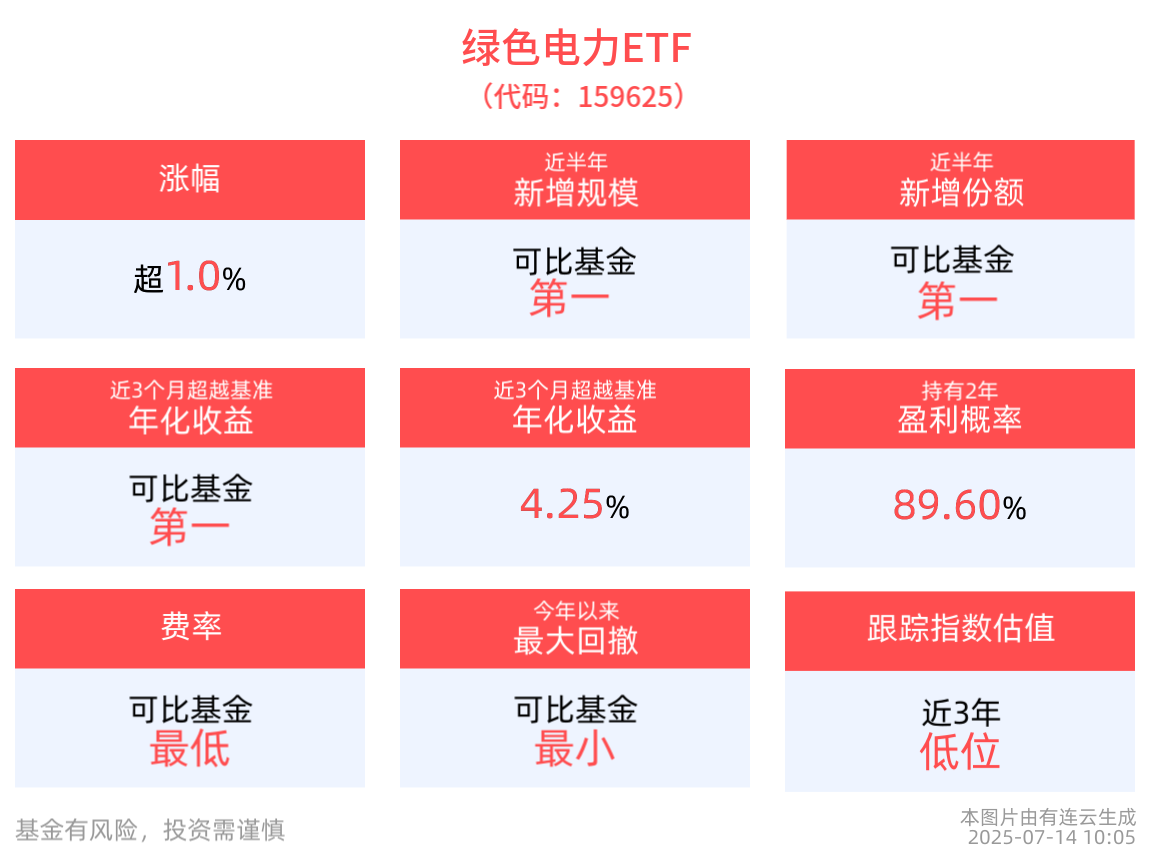 截至2025年7月14日10:05,国证绿色电力指数强势上涨1.18%,成分股京运通涨停,立新能源上涨4.08%,上海电力上涨3.63%,甘肃能源、嘉泽新能等个股跟涨。绿色电力ETF(159625)上涨1.03%。