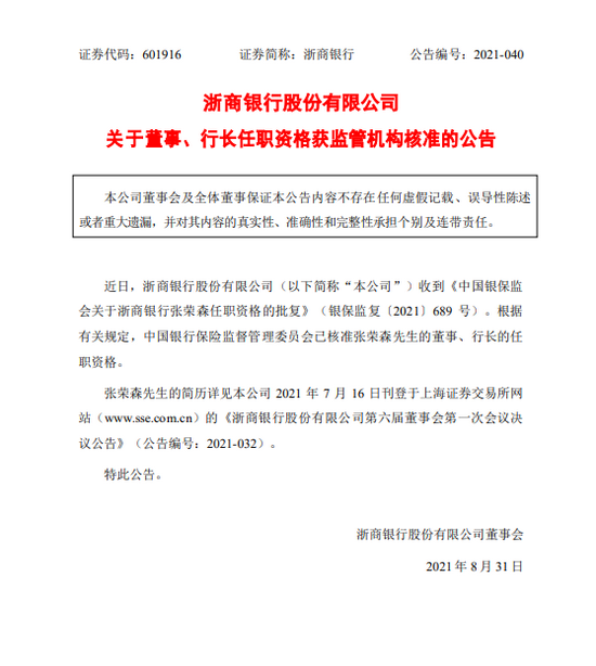 9月1日消息,浙商银行发布公告,该行近日收到《中国银保监会关于浙商银行张荣森任职资格的批复》(银保监复〔2021〕689 号)。根据有关规定,中国银行保险监督管理委员会已核准张荣森的董事、行长的任职资格。