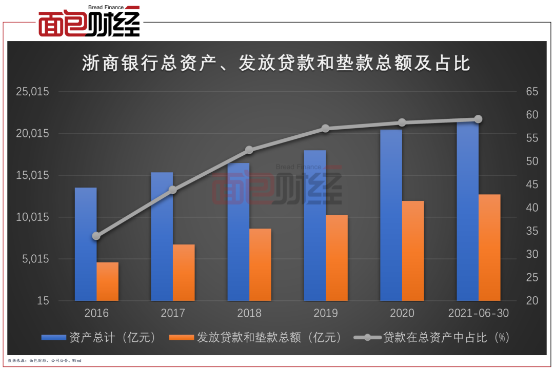 资产规模扩大的同时,该行的资产结构不断优化,贷款占总资产比例近几年来明显提升。数据显示,截至2021年6月末,发放贷款和垫款总额占总资产比例为59.1%,较年初提升0.6个百分点。2018、2019和2020年分别较前一年末提升8.8、4.7和1.3个百分点。