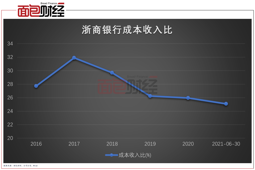 翻阅历史数据,浙商银行的成本收入比由2017年的31.91%下降至2020年末的25.96%,截至2021年6月末,该行的成本收入比再次下降0.87个百分点至25.09%。