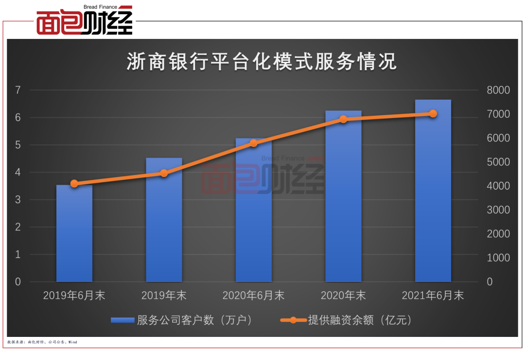 大跨境板块则得益于数字化、平台化理念在外贸领域的创新应用。浙商银行持续创新优化“网银极速开证”“涌金全球汇”等多场景的在线服务,打造内外贸一体的供应链金融服务。2021年6月末,该行提供国际结算服务770.35亿美元,同比增长58%,投放表内外国际贸易融资98.42亿美元,同比增长12%,其中通过平台化模式投放融资37.93亿美元。
