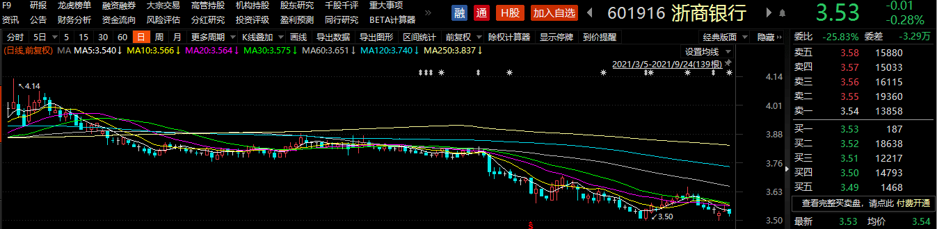 但此次高管增持的利好消息并未对浙商银行股价产生足够的提振效果。9月24日,浙商银行收于3.53元/股,日跌0.01元/股,跌幅为0.28%。
