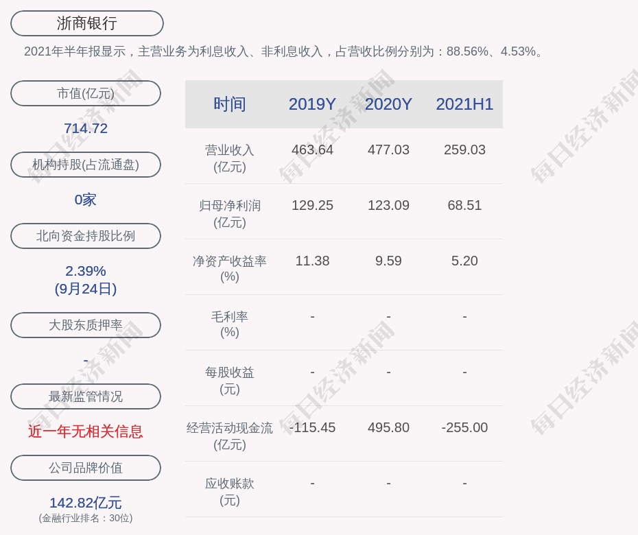 2021年半年报显示,浙商银行的主营业务为利息收入、非利息收入,占营收比例分别为:88.56%、4.53%。