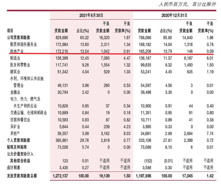 以规模来看,房地产业贷款是浙商银行对公业务的第二大支柱,截至半年末时余额1722.1亿元,占公司贷款和垫款比重为13.54%,仅略微低于租赁和商务服务业13.6%的占比。