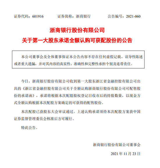 11月23日消息,浙商银行公告,今日,公司收到第一大股东浙江省金融控股有限公司出具的《浙江省金融控股有限公司关于全额认购浙商银行股份有限公司可配售股份的承诺函》,承诺将根据本次配股股权登记日收市后的持股数量,以现金方式全额认购根据本次配股方案确定的可获得的配售股份。