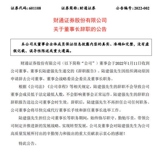 当日晚间,财通证券(601108.SH)发布公告称,公司董事会于2022年1月11日收到董事、董事长陆建强先生递交的《辞职报告》。陆建强因组织调动原因申请辞去公司董事、董事会战略委员会委员及董事长职务。
