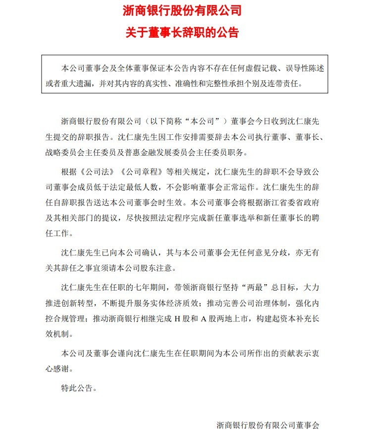 昨日晚间,浙商银行发布公告称,董事会1月11日收到沈仁康提交的辞职报告。沈仁康因工作安排需要辞去浙商银行执行董事、董事长、战略委员会主任委员及普惠金融发展委员会主任委员职务。