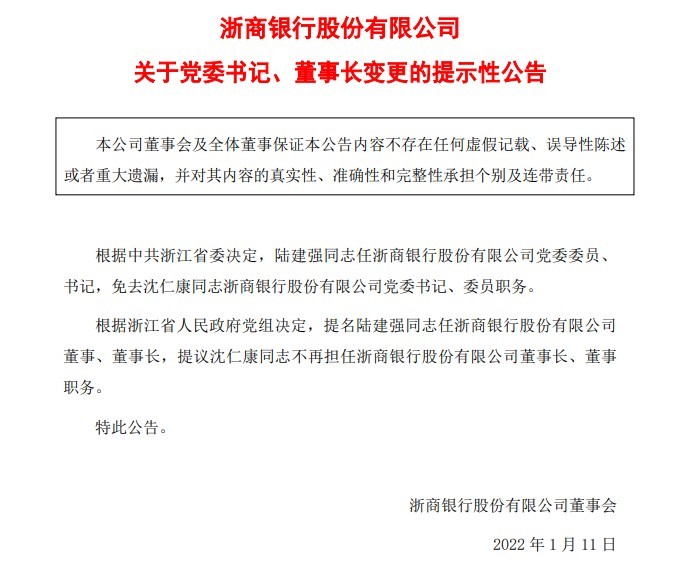 同时,浙江银行公告还显示,根据中共浙江省委决定,陆建强任浙商银行党委委员、书记,免去沈仁康浙商银行党委书记、委员职务。根据浙江省人民政府党组决定,提名陆建强任浙商银行董事、董事长,提议沈仁康不再担任浙商银行董事长、董事职务。