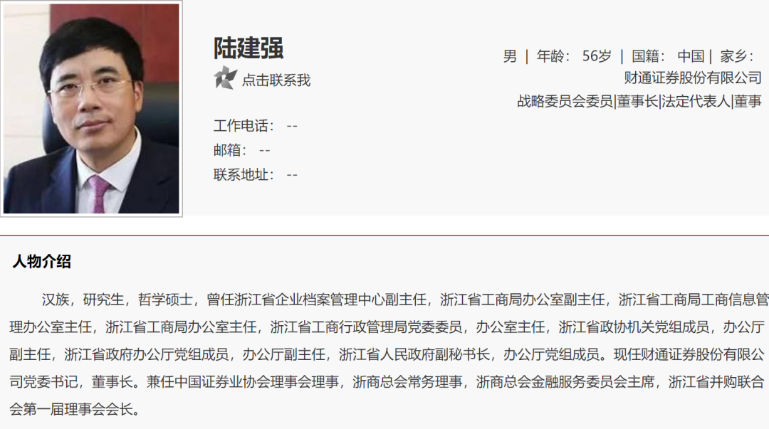 公开信息显示,陆建强,1965年4月出生,哲学硕士,中国国籍,无境外永久居留权。曾任浙江省企业档案管理中心副主任,浙江省工商局办公室副主任,浙江省工商局工商信息管理办公室主任,浙江省工商局办公室主任,浙江省工商行政管理局党委委员、办公室主任,浙江省政协机关党组成员、办公厅副主任,浙江省政府办公厅党组成员、办公厅副主任,浙江省人民政府副秘书长、办公厅党组成员。