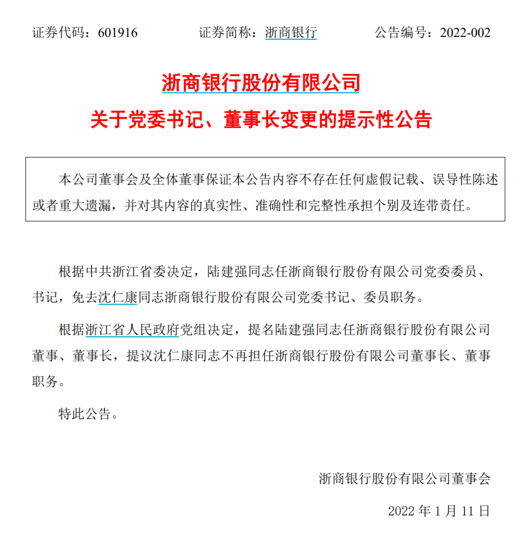 1月11日晚间,浙商银行发布《关于党委书记、董事长变更的提示性公告》称,陆建强担任浙商银行党委委员、书记,提名任董事、董事长;提议沈仁康不再担任董事、董事长,免去党委委员、书记职务。