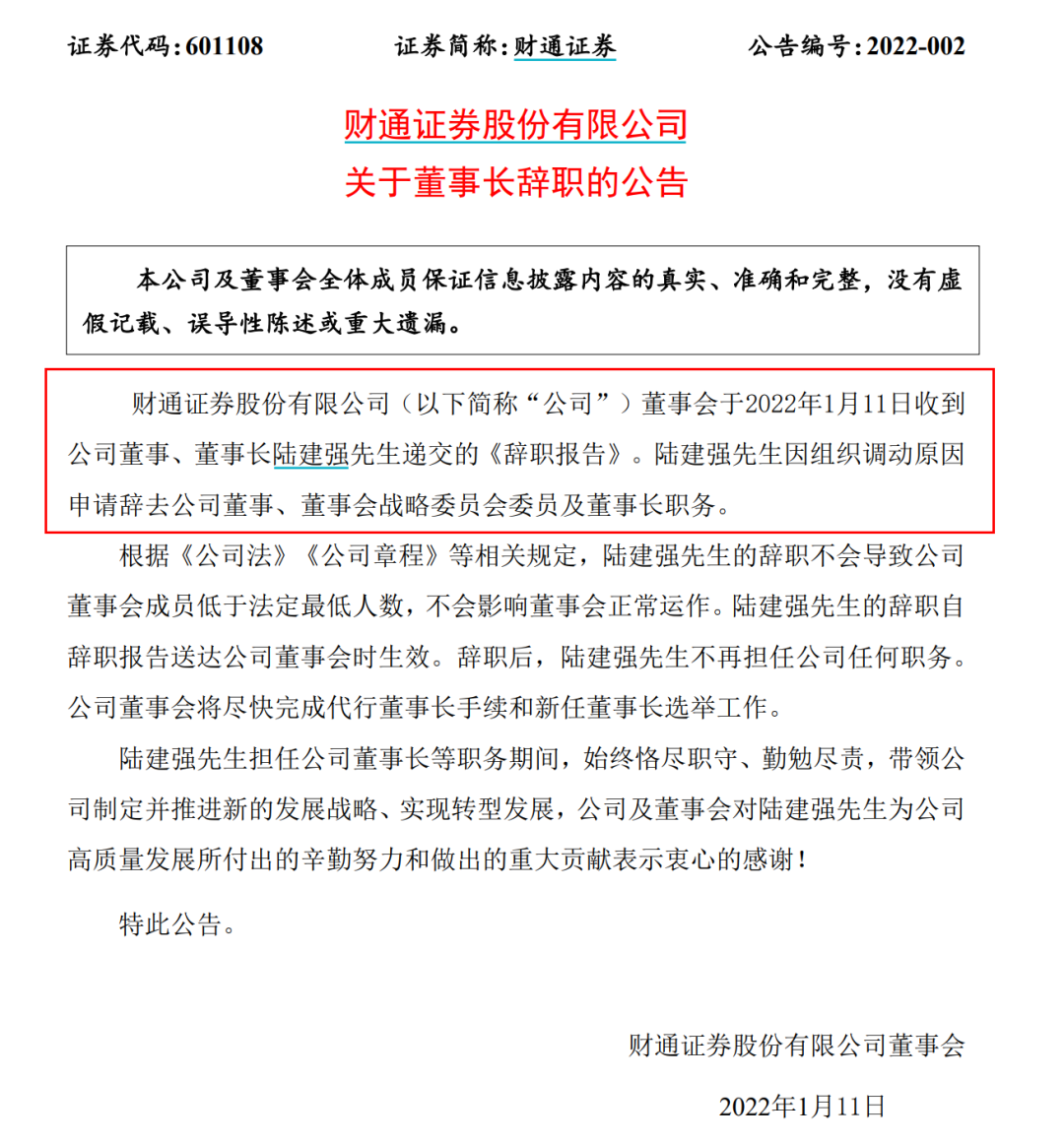 1月11日晚间,财通证券发布董事长辞职公告:公司董事会于2022年1月11日收到公司董事、董事长陆建强先生递交的《辞职报告》。陆建强先生因组织调动原因申请辞去公司董事、董事会战略委员会委员及董事长职务。