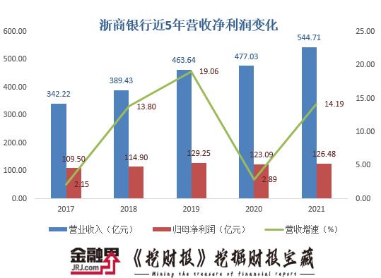 2021年浙商银行全年营收544.71亿元,增长14.2%。其中,利息净收入419.52亿元,非利息净收入125.19亿元;分别较上年增长13.09%、18.01%。全年归属于该行股东的净利润126.48亿元,扭转前一年下降态势,增长2.75%。
