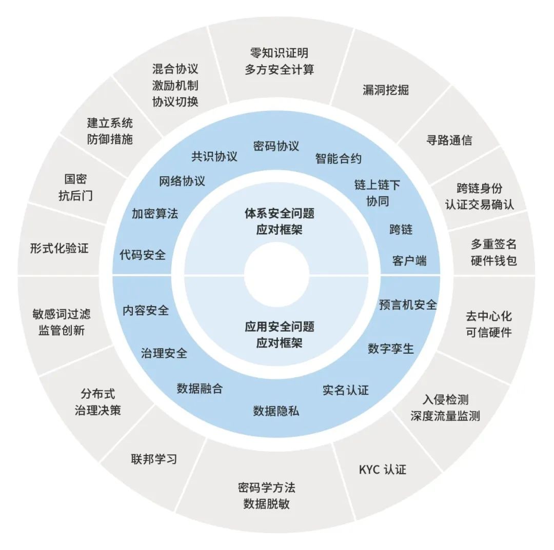 对于一系列区块链体系安全问题,白皮书一一提出了形式化验证、国密抗后门、建立系统防御措施等应对措施与建议,从技术上最大限度地增强区块链的安全性。对于一系列金融应用层安全问题,白皮书一一提出了敏感词过滤、分布式治理决策、联邦学习等应对框架,以加强金融应用层的隐私性、安全性。