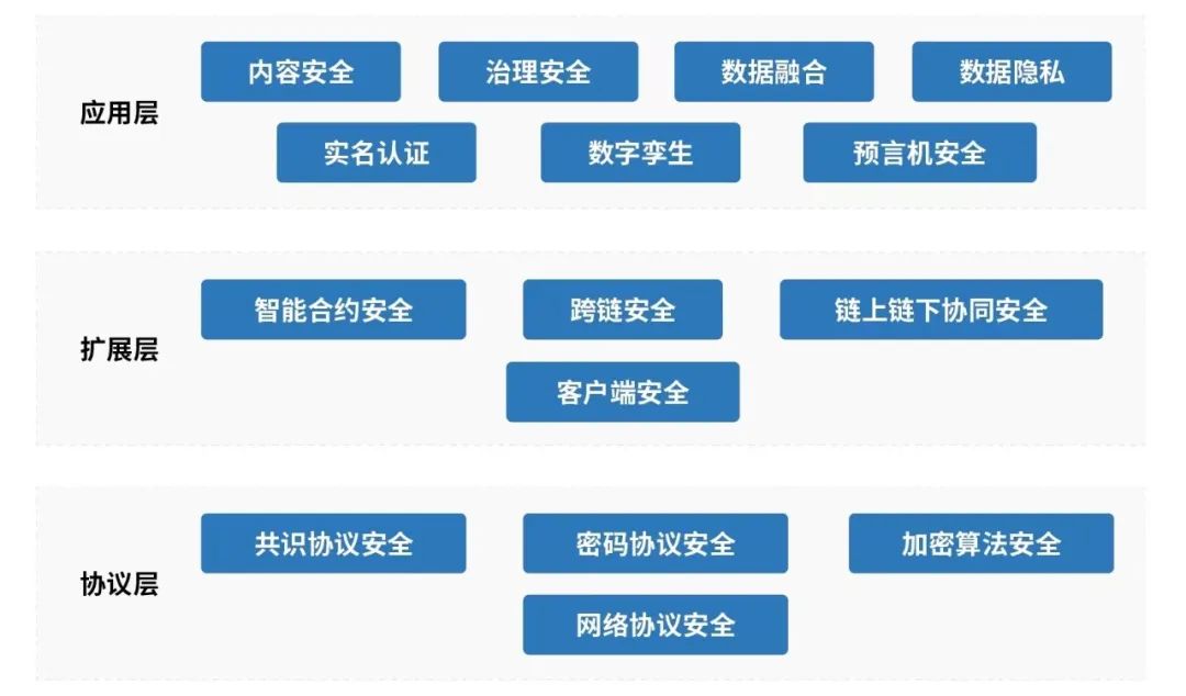 白皮书中提到,金融应用时面临的区块链安全问题可以分为区块链体系安全问题与金融应用层安全问题。区块链体系安全问题包括区块链在共识、密码、加密算法、网络等协议层上的安全问题,以及在智能合约、跨链、链上链下协同、客户端上的扩展层安全问题;金融应用层安全问题包括区块链应用在内容、治理、数据融合、数据隐私、实名认证、数字孪生、预言机上的安全问题。