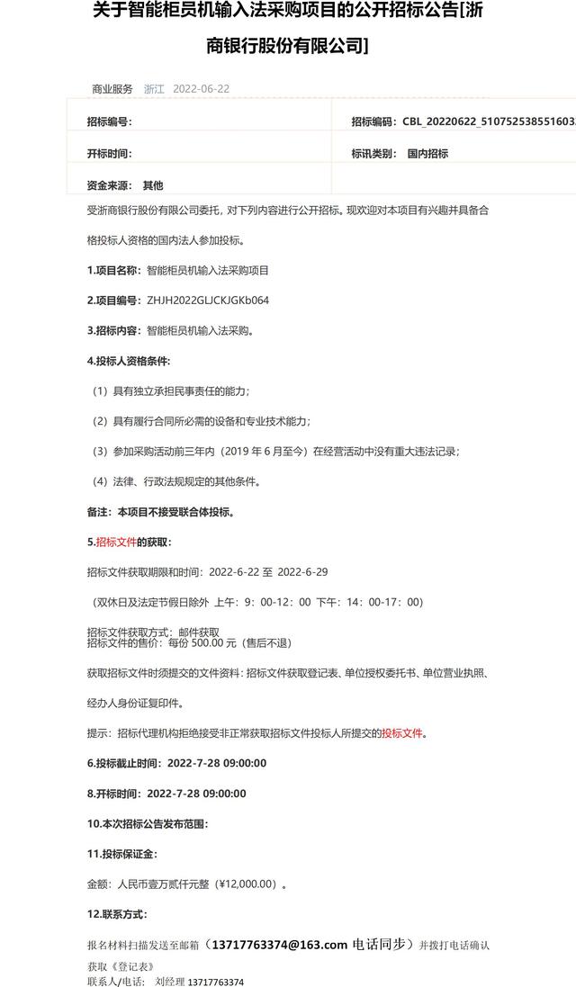 关于智能柜员机输入法采购项目的公开招标公告[浙商银行股份有限公司]