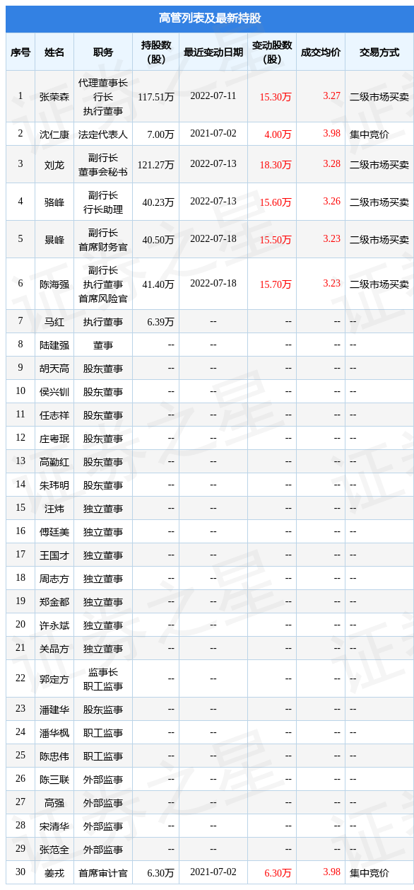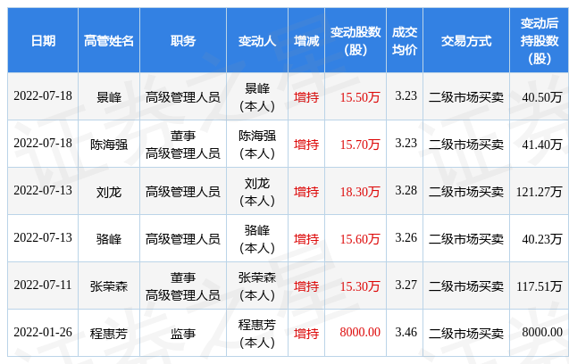 根据7月18日市场公开信息、上市公司公告及交易所披露数据整理,浙商银行(601916)最新董监高及相关人员股份变动情况:2022年7月18日公司高级管理人员景峰、董事,高级管理人员陈海强共增持公司股份31.2万股,占公司总股本为0.0014%。变动期间公司股价上涨1.25%,7月18日当日收盘报3.25元。