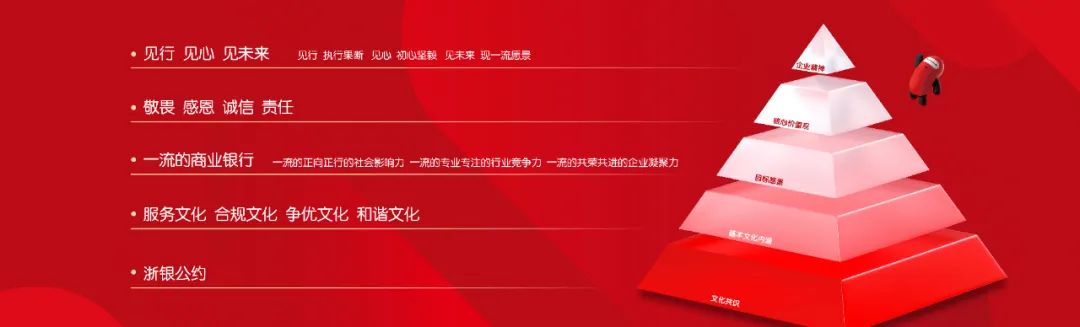 浙商银行18年来的历程,既是一部砥砺前行的创业奋斗史,也是一部接续传承的文化发展史。今年4月,召开文化建设大会,确立“敬畏、感恩、诚信、责任”的核心价值观,提出“一流的正向正行的社会影响力、一流的专业专注的行业竞争力、一流的共荣共进的企业凝聚力”的目标愿景,以及“服务文化、合规文化、争优文化、和谐文化”的基本文化内涵,将《浙银公约》作为文化共识,通过文化塑形、文化植根、文化滋养、文化传扬四大工程抓好落地,搭建了企业文化体系的“四梁八柱”。