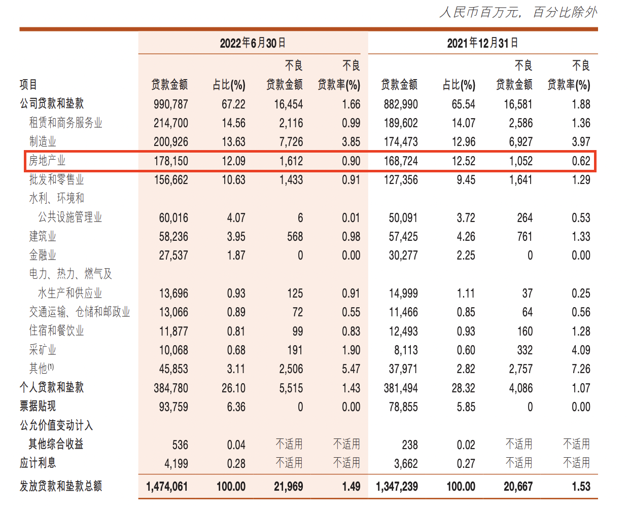 截至6月末,按行业划分的贷款和不良贷款分布情况,浙商银行房地产不良贷款余额16.12亿元,较上年末增加5.6亿元,增幅为53.23%;不良贷款率为0.9%,较上一年上升0.28个百分点。
