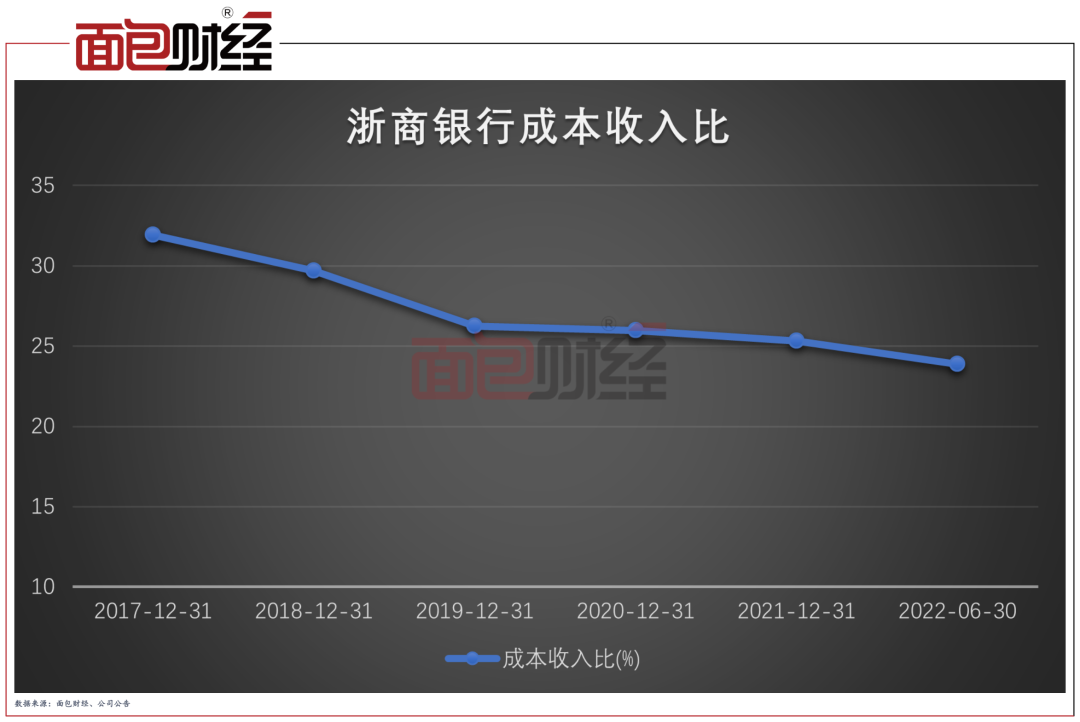 翻阅历史数据,浙商银行的成本收入比由2017年的31.91%下降至2021年末的25.31%,截至2022年6月末,该行的成本收入比再次下降1.43个百分点至23.88%。
