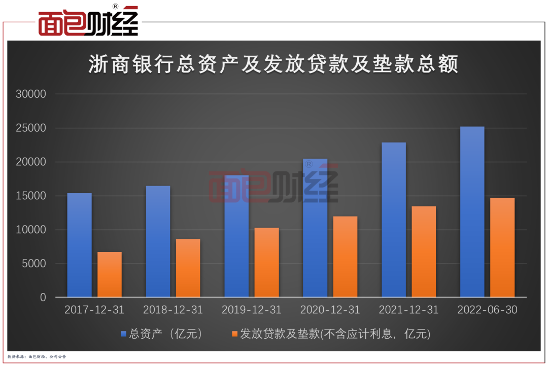 截至2022年6月末,该行总资产达2.52万亿元,较上年末增加2345.21亿元,增幅为10.26%。其中,发放贷款和垫款总额(不含应计利息)约为1.47万亿元,较上年末增加1262.85亿元,增幅为9.4%。