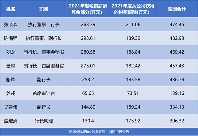另据浙商银行2021年年报披露的数据,张荣森从公司获得税前报酬为211.06万元,其次是陈海强和副行长吴建伟,分别为189.32万元、189.24万元。