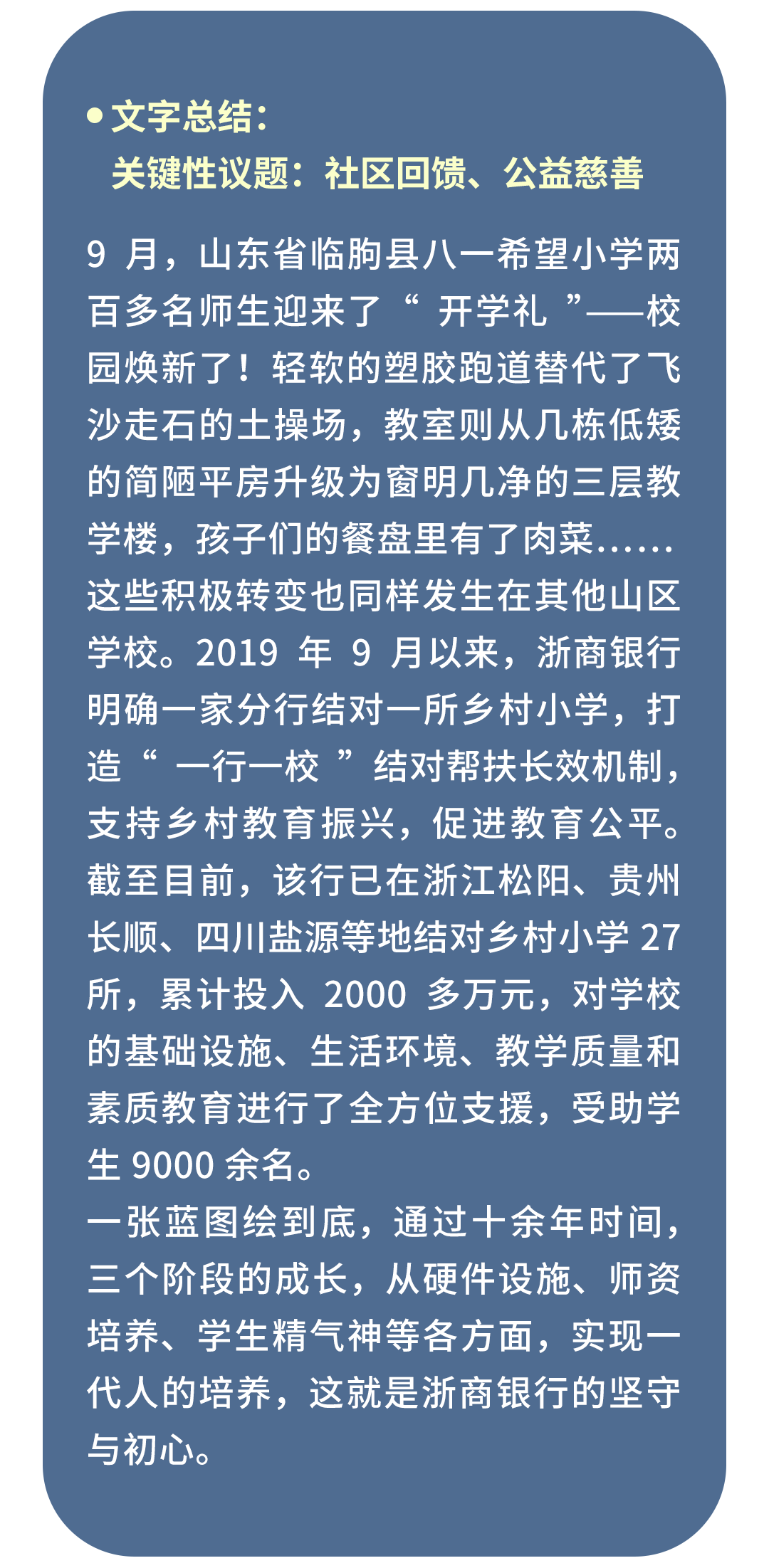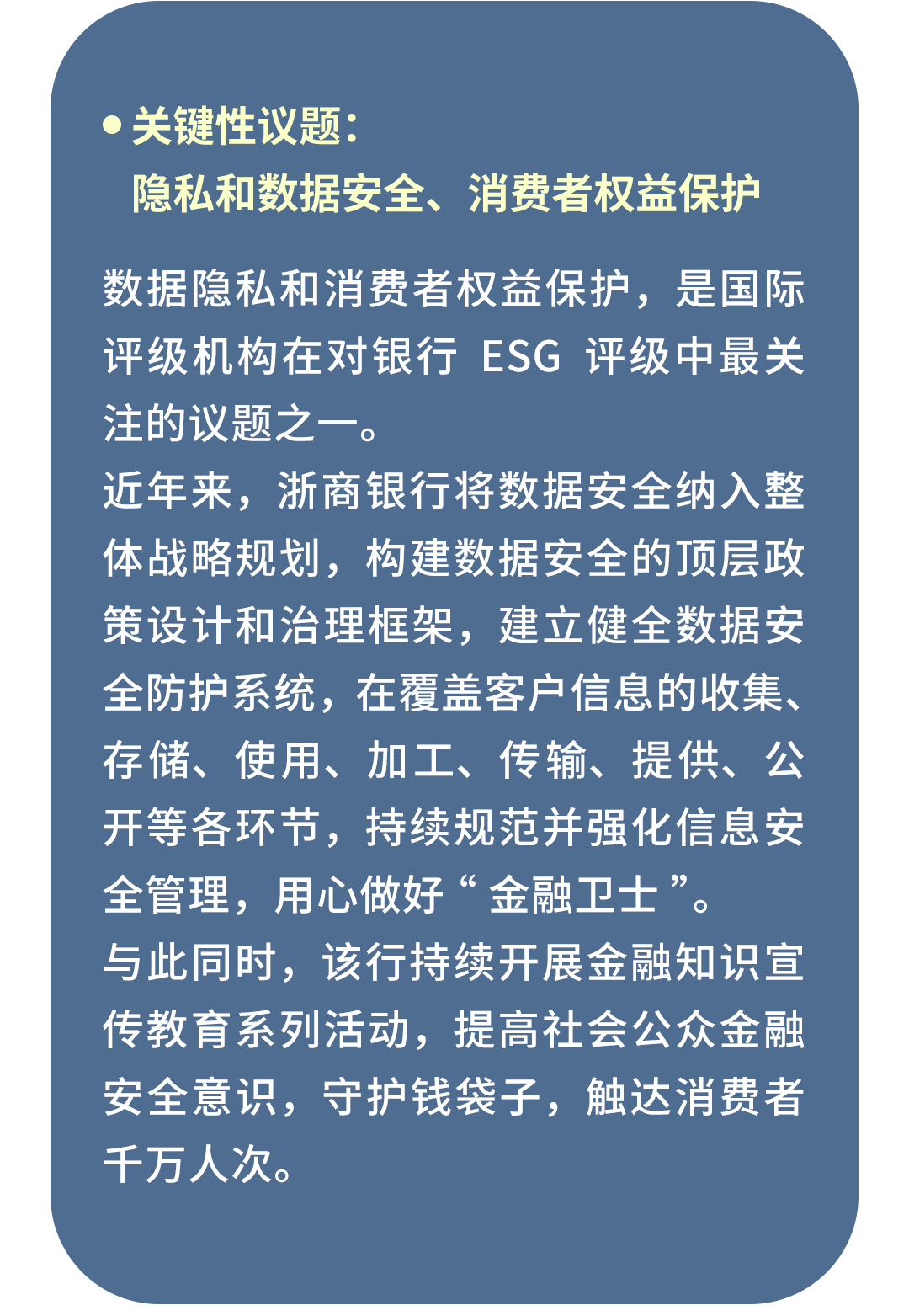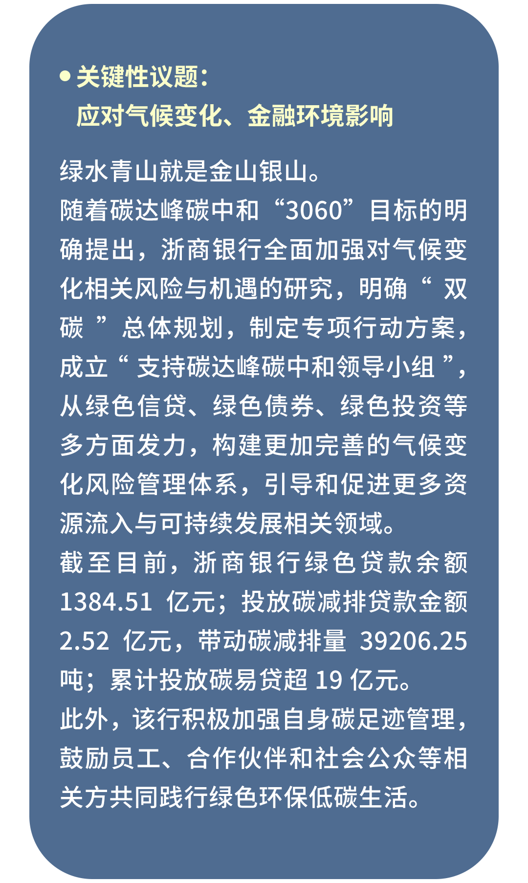 近年来,浙商银行坚持正行向善,主动担当作为,将ESG理念嵌入核心业务和商业运营,持续呼应国家与时代的需要,努力创造社会、环境、经济的长期价值。