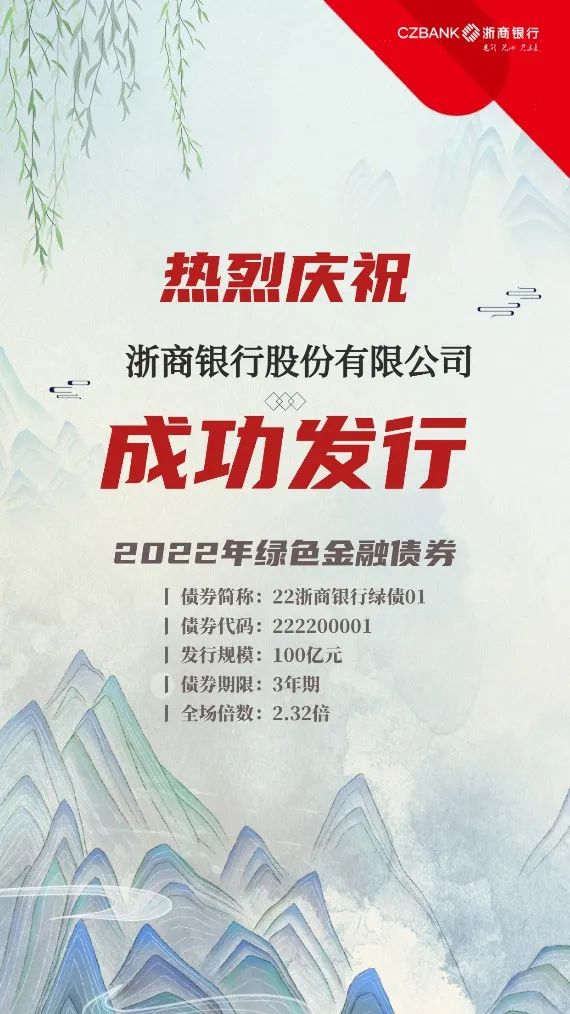 2022年12月13日,浙商银行股份有限公司(以下简称浙商银行)面向全国银行间债券市场成功簿记发行绿色金融债券,本期债券发行规模100亿元,根据适用法律和监管部门批准,募集资金将用于《绿色债券支持项目目录(2021年版)》规定的绿色产业项目。本期债券发行获得了市场投资者的热烈反响和踊跃认购,投资者类型涵盖商业银行、证券公司、基金公司、保险公司等多层次投资主体,最终全场认购倍数达2.32倍,充分体现了投资者对浙商银行及其绿色金融实践的认可。