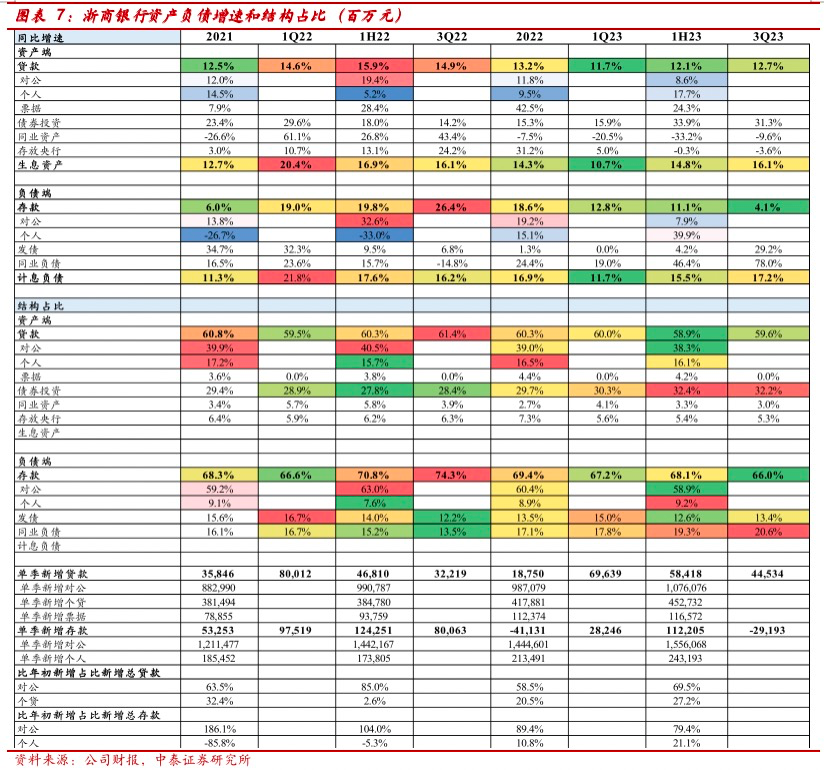 资产端:信贷增长较好。1、资产增速及结构:1Q23-3Q23生息资产同比增16.1%;总贷款同比增12.7%,债券投资维持高增31.3%,同业资产连续四个季度同比下降。贷款、债券投资、同业业务分别占比59.6%、32.2%和3.0%,占比较1H23变动+0.7、+2.2和-0.3pcts。2、信贷增长情况:3Q23单季新增贷款445亿,较去年3Q22单季多增123亿;前三季度新增贷款1726亿,较去年同期多增136亿,信贷投放较好。
