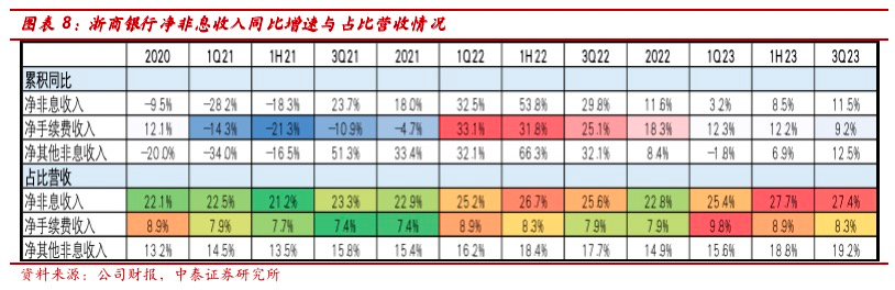 净非息收入增速走高、同比增11.5%,较1H23增速边际上升3个点(1H23同比+8.5%),净手续费收入同比增9.2%(vs1H23同比+12.2%)增速边际略有走弱,净其他非息收入同比增12.5%(vs1H23同比+6.9%),增速边际拉升。1Q23-3Q23,净非息、净手续费和净其他非息收入分别占比营收27.4%、8.3%和19.2%,其他非息收入占比有所提升。