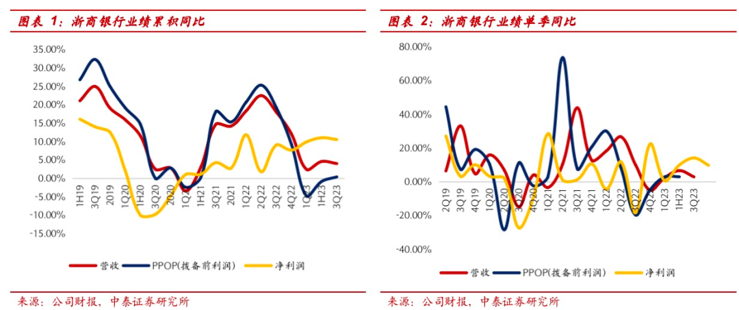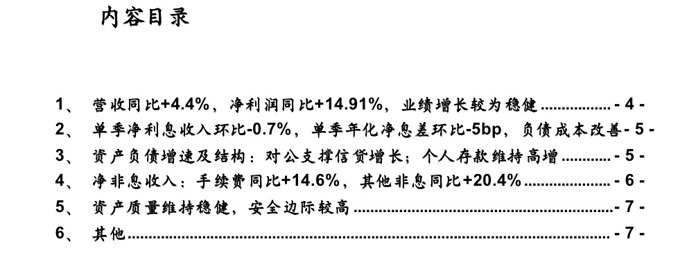 财报综述:1、营收同比+4%,净利润同比+10.5%,业绩增长稳健。前三季度营收同比+4.0%(vs 1H23同比+4.6%),其中净利息收入同比+1.4%;净非息收入同比+11.5%。利润同比增10.5%(vs 1H23同比+11%)。2、单季净利息收入环比-2%,单季年化净息差环比下降9bp至1.89%,单季年化资产收益率环比下降5bp至4.41%,计息负债付息率环比上升4bp至2.41%。3、资产负债:贷款增长提速,存款增长放缓。(1)资产端:生息资产同比增16.1%;总贷款同比增12.7%,债券投资维持高增31.3%,同业资产连续四个季度同比下降。3Q23单季新增贷款445亿,较去年3Q22单季多增123亿;前三季度新增贷款1726亿,较去年同期多增136亿,信贷投放较好。(2)负债端:总负债同比增17.2%;总存款同比增4.1%,发债同比增29.2%,同业负债同比增78%。4、净非息收入增速走高、同比增11.5%,较1H23增速边际上升3个点(1H23同比+8.5%),净手续费收入同比增9.2%(vs1H23同比+12.2%)增速边际略有走弱,净其他非息收入同比增12.5%(vs1H23同比+6.9%),增速边际拉升。5、资产质量:资产质量维持稳健,安全边际进一步提升。不良维度——不良率环比维持在1.45%,年化不良净生成为1.06%、环比下降13bp,绝对值水平低。拨备维度——拨备覆盖率环比上升52bp至182.94%;拨贷比2.65%,环比上升1bp。6、配股完成,核心一级资本充足率环比上升。公司6-7 月完成A和H股配股工作,分别募集97.56 亿元、30.47 亿港元。3Q23核心一级资本充足率、一级资本充足率、资本充足率分别为8.28%、9.62%、11.83%,环比变动+10、+5、+0bp。