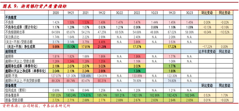 公司经营稳健,不良率环比维持在1.45%,安全边际提升。1、不良维度——不良率环比维持在1.45%;公司3Q23年化不良净生成为1.06%、环比下降13bp,绝对值水平低。2、拨备维度——安全边际环比持续提升。3Q23拨备覆盖率环比上升52bp至182.94%;拨贷比2.65%,环比上升1bp。