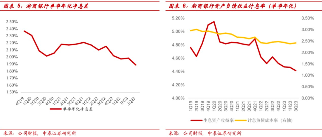 3Q23单季净利息收入环比下跌2%,生息资产规模环比增1.5%,单季年化净息差环比下降9bp至1.89%,由资产负债两端共同带动,资产端收益率有所下行,负债端成本则有所上升。单季年化资产收益率环比下降5bp至4.41%,预计主要受贷款利率下行影响。计息负债付息率环比上升4bp至2.41%。