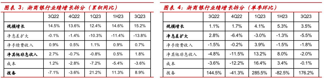 3Q23业绩累积同比增长拆分:规模增长提供主要正向业绩贡献,对业绩支正向贡献15.2个点;其次为拨备释放,对业绩贡献8.9个点。细看各因子贡献边际变化情况,其中对业绩贡献边际改善的有:1、规模增长正向贡献边际提升0.7个点至15.2%。2、净其他非息收入正向贡献提升1.3个点。3、成本负向贡献收窄1.8个点。4、税收节约效应继续增强,对业绩正向贡献边际提升1个点。边际贡献减弱的有:1、净息差负向贡献扩大2.4个百分点。2、拨备释放的正向贡献收窄2.4个点。3、净手续费正向贡献边际走弱0.2个点。
