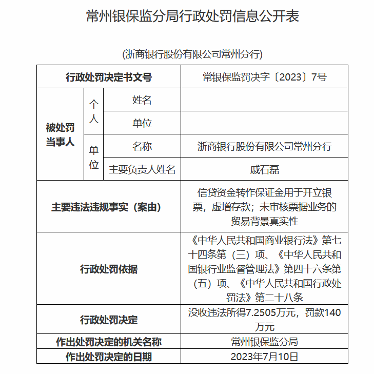 浙商银行年内曾领百万级罚单。7月14日,国家金融监督管理总局江苏监管局公布两张行政处罚信息公开表。处罚信息显示,浙商银行常州分行因信贷资金转作保证金用于开立银票,虚增存款以及未审核票据业务的贸易背景真实性两项违法违规事由,被江苏监管局依据《中华人民共和国商业银行法》第七十四条第(三)项、《中华人民共和国银行业监督管理法》第四十六条第(五)项、《中华人民共和国行政处罚法》第二十八条被没收违法所得7.2505万元,并罚款140万元。曹创因对浙商银行常州分行两项违法违规事由负管理责任,被警告并罚款8万元。