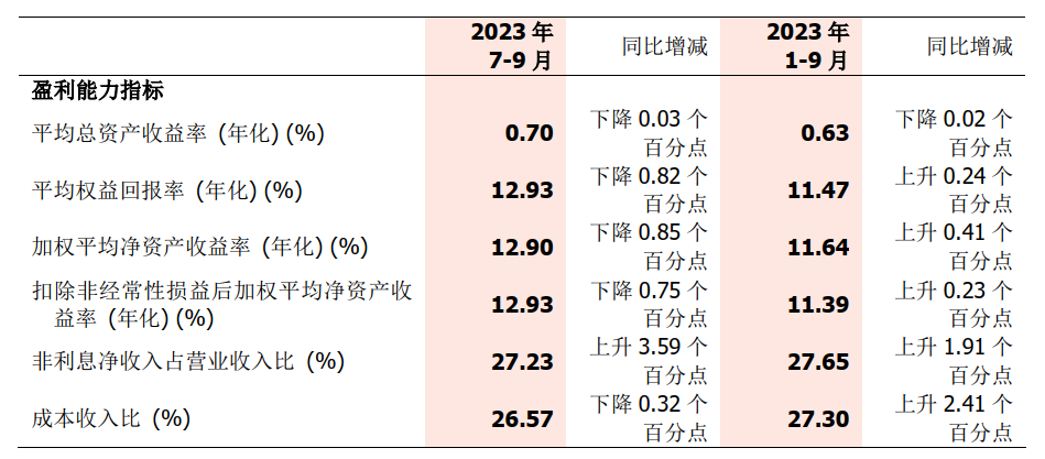10月27日,浙商银行发布三季报。从主要会计数据及财务指标来看,截至报告期末,浙商银行每股净资产为5.77元,较上年末的6.49元下降了11.09%;负债总额27701.21亿元,比上年末增加3141.21亿元,增长12.79%。盈利能力指标方面,浙商银行三季度内七项盈利能力指标呈现同比下降态势。其中,平均权益回报率、加权平均净资产收益率、扣除非经常性损益后加权平均净资产收益率分别下降0.82、0.85、0.75个百分点。
