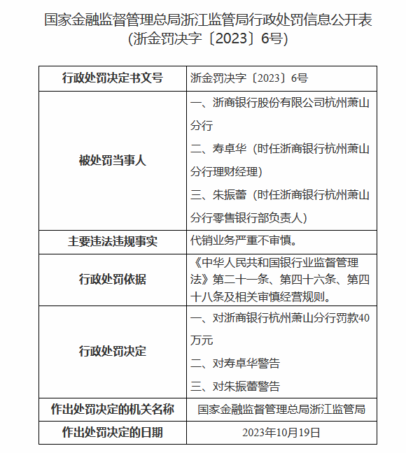 10月20日,国家金融监督管理总局浙江监管局(下文简称“浙江监管局”)公布行政处罚信息公开表浙金罚决字〔2023〕6号,剑指浙商银行股份有限公司杭州萧山分行及相关负责人。根据罚单内容,浙商银行杭州萧山分行代销业务严重不审慎。浙江监管局依据《中华人民共和国银行业监督管理法》第二十一条、第四十六条、第四十八条及相关审慎经营规则对浙商银行杭州萧山分行罚款40万元。时任浙商银行杭州萧山分行理财经理的寿卓华、时任浙商银行杭州萧山分行零售银行部负责人的朱振蕾分别被处以警告。