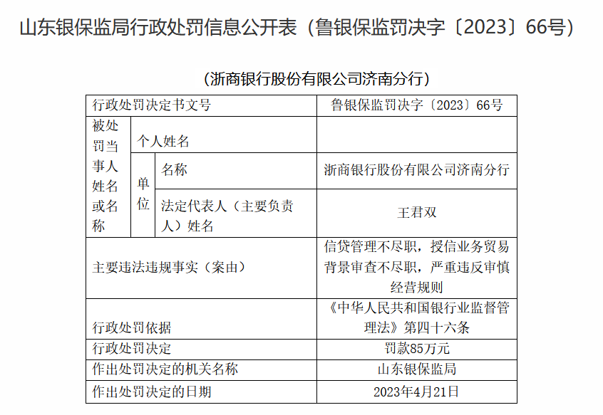 4月24日,国家金融监督管理总局山东监管局(下文简称“山东监管局”)公布鲁银保监罚决字〔2023〕66号行政处罚信息公开表。浙商银行股份有限公司济南分行因信贷管理不尽职、授信业务贸易背景审查不尽职、严重违反审慎经营规则三项主要违法违规事由,被山东监管局依据《中华人民共和国银行业监督管理法》第四十六条罚款85万元。