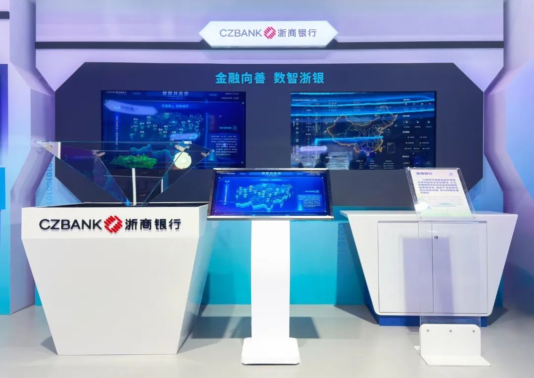 浙商银行受邀在此次数贸会核心展馆“浙江馆”内参展。浙商银行展区以“金融向善、数智浙银”为主题,分为“普惠金融”“供应链金融”“跨境金融”三大板块,借助全息投影、虚拟交易、驾驶舱展示等数字化手段,生动展示了浙商银行一系列有特色、有亮点的数字化创新产品与服务。