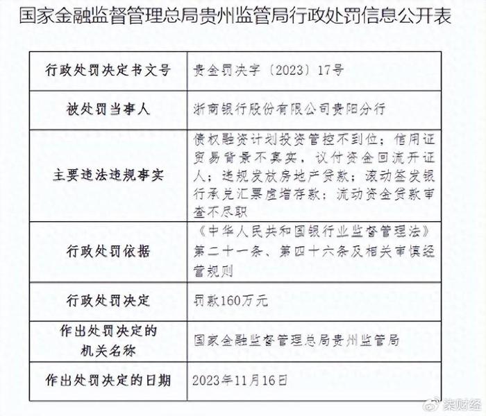 11月27日,据国家金融监督管理总局贵州监管局公布的行政处罚信息,浙商银行股份有限公司贵阳分行(下称浙商银行贵阳分行)收160万元罚单,5名相关责任人也被罚。