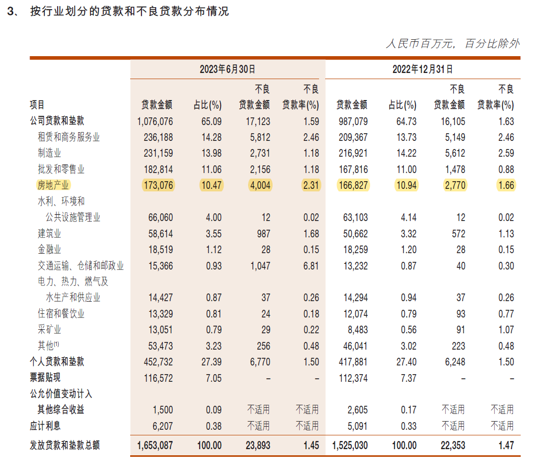 今年以来,浙商银行房地产不良贷款情况备受关注,其房地产业不良贷款率从2021年的0.62%上升至2023年中的2.31%,意味着在不到两年时间内番了差不多4倍。