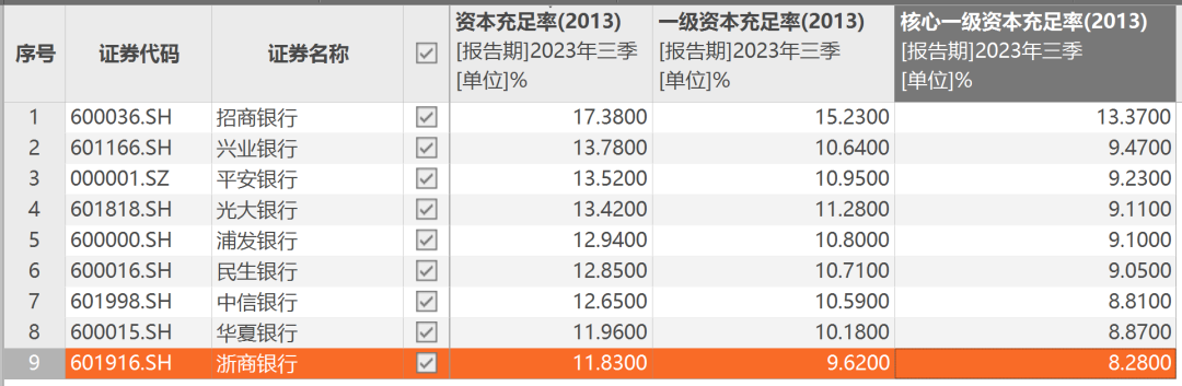 截至2023年三季度末,浙商银行资本充足率、一级资本充足率、核心一级资本充足率分别为11.83%、9.62%、8.28%,均在上市股份制银行中垫底。