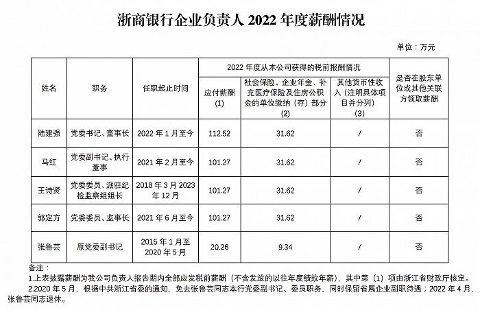 12月31日,浙商银行在官网披露企业负责人2022年度薪酬情况: