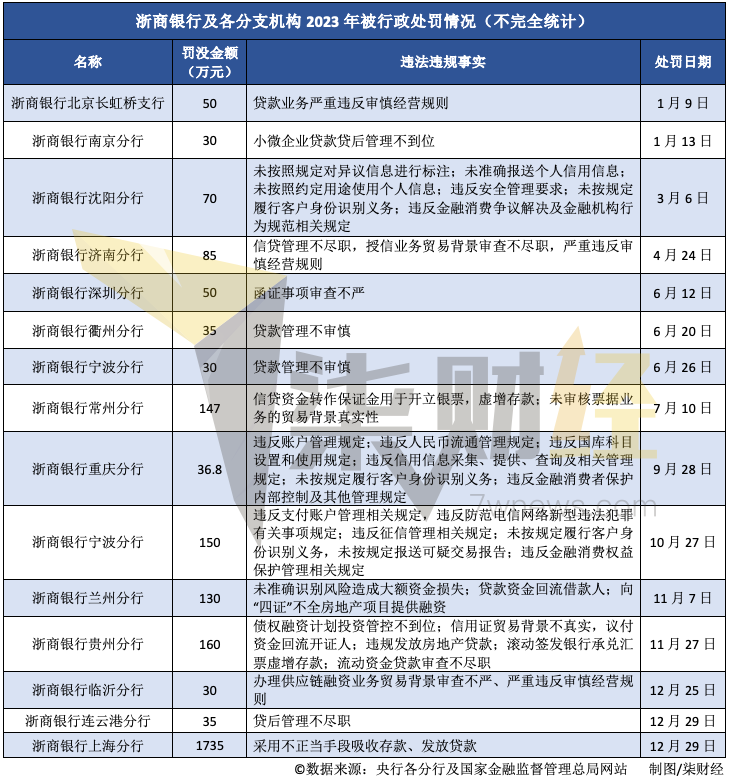 柒财经注意到,去年,浙商银行几乎月月收罚单。